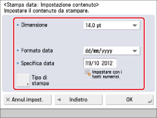 La posizione della data può inoltre essere variata. (Vedere "Registrazione/modifica/eliminazione di un testo definito dall'utente per i numeri di pagina e le filigrane".)