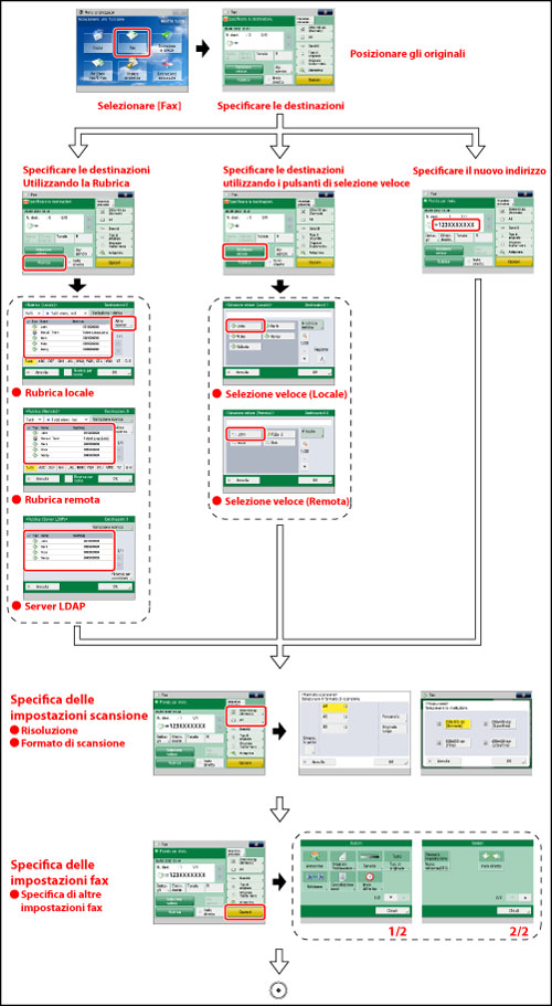 Premere per selezionare altre impostazioni. È possibile impostare utili funzioni di fax quali ad esempio la verifica del contenuto di un documento acquisito prima di inviarlo o l'invio di originali in fronte-retro.