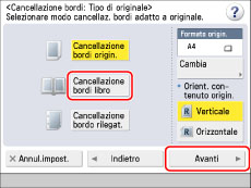 Premere [Cancellazione bordi libro] → selezionare l'orientamento dell'originale → premere [Avanti].