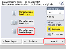 Premere [Cancellazione bordo rilegat.] → selezionare l'orientamento dell'originale → premere [Avanti].