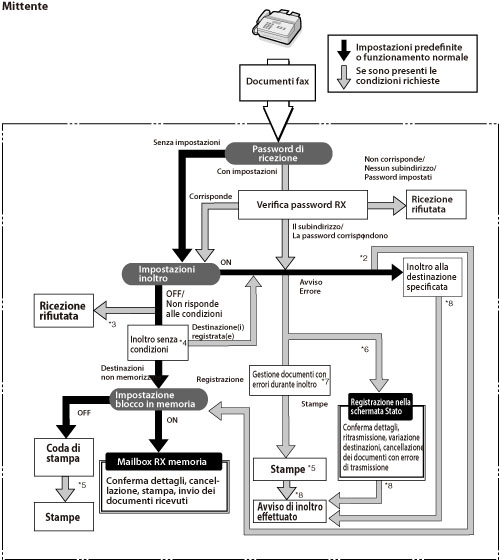 *2 Se si imposta <Memoriz./Stampa file ric.> su 'On' in [Impostazioni inoltro], i documenti inoltrati vengono stampati oppure memorizzati nella Mailbox RX memoria.