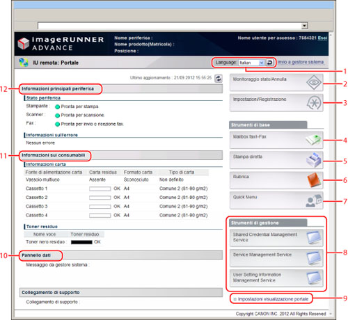 Se si cambia la lingua del display dalla pagina del portale della IU remota, e la lingua selezionata è diversa da quella utilizzata sul pannello digitale della macchina, la lingua potrebbe non essere visualizzata correttamente.