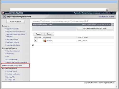 (Impostazioni/Registrazione) → [Impostazione destinazione] → [Registrazione server LDAP]. Per istruzioni sull'utilizzo del pannello comandi per la definizione delle impostazioni LDAP, vedere "Impostazione del server LDAP".Per specificare le impostazioni del server LDAP, è necessario accedere come amministratore.