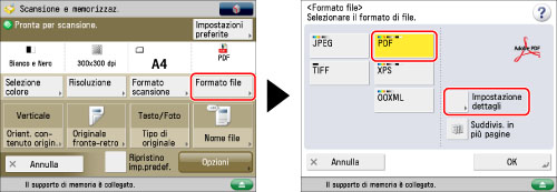 Se si seleziona [Traccia e smussa] per il formato file PDF, il modo colore viene modificato da [Autom. (Color./Nero)] o [Bianco e Nero] a [Autom. (Colore/Grig)] e [Scala di grigi]. Per acquisire il documento nel modo colore selezionato, modificare il formato di file PDF su una qualsiasi opzione diversa da [Traccia e smussa] o [Compresso].