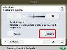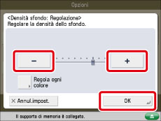 Se si regola la densità sfondo premendo [Regola] per <Densità sfondo>, l'impostazione [Autom.] viene annullata. Allo stesso modo, se si preme [Autom.] durante la regolazione manuale in [Regola], le regolazioni vengono annullate. La macchina regola automaticamente la densità in base allo sfondo.