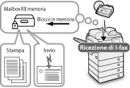 I documenti I-fax ricevuti possono essere registrati nella mailbox RX memoria senza essere stampati. È possibile verificare le informazioni del mittente e il numero di pagine di un documento, prima di stamparlo o di inoltrarlo a un'altra destinazione.