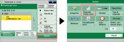 Se occorre acquisire un originale posizionato in senso verticale come documento fronte-retro, selezionare [Verticale] in [Orient. contenuto origin.]. (Vedere "Selezione dell'orientamento dell'immagine originale".)
