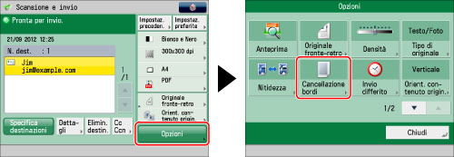 Specificare la destinazione → premere [Opzioni] → [Cancellazione bordi].