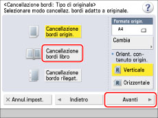 Premere [Cancellazione bordi libro] → selezionare l'orientamento dell'originale → premere [Avanti].