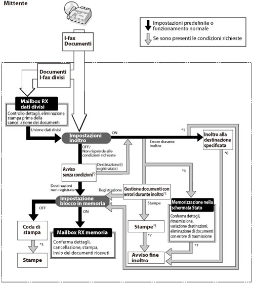 *1 Se si imposta <Memoriz./Stampa file ric.> su 'On' in [Impostazioni inoltro], i documenti inoltrati vengono stampati oppure memorizzati nella Mailbox RX memoria.