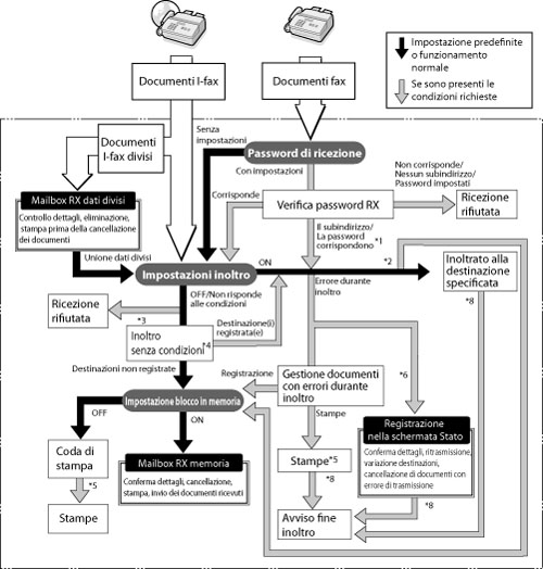 *2 Se si imposta <Memoriz./Stampa file ric.> su 'On' in [Impostazioni inoltro], i file inoltrati vengono stampati oppure memorizzati nella Mailbox RX memoria. Per magggiori informazioni su Store/Print Received File, vedere il punto 15 di