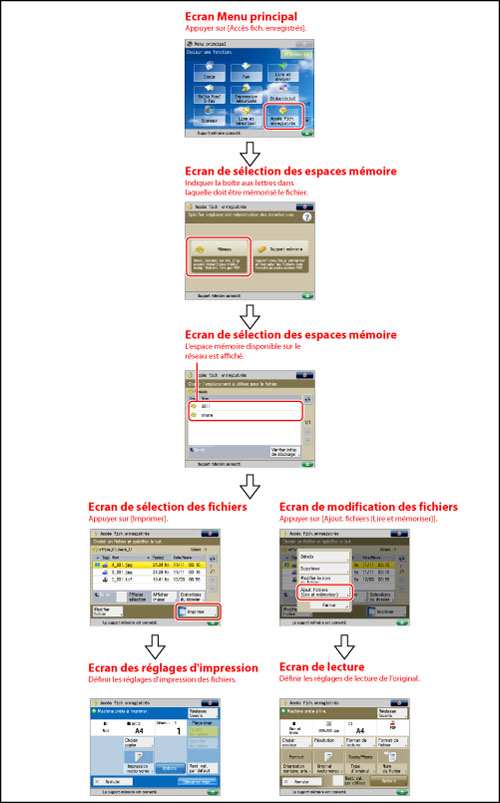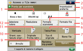 Per la procedura riguardante [Aggiunta file (Scans. e memorizz.)] e le istruzioni su come utilizzare la schermata Scansione, vedere "Aggiunta di un file (Scansione e memorizzazione)" e "Flusso delle operazioni di scansione e memorizzazione".