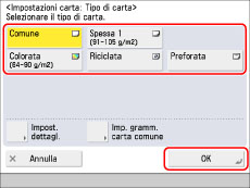Se il tipo di carta caricato non è compreso nell'elenco della schermata delle impostazioni dettagliate, è possibile registrarlo nell'elenco del tipo di carta. Per informazioni dettagliate sulla registrazione dei tipi di carta, vedere "Registrazione/modifica dei tipi di carta personalizzati".