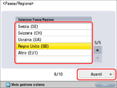 Per modificare <Paese/Regione>, è necessario cambiarne le impostazioni da [Avvio Guida alla configurazione] (Impostazioni/Registrazione).