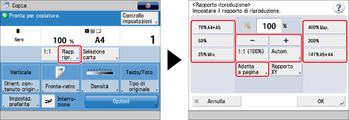 Se si imposta [Autom.], è necessario selezionare il formato carta manualmente. Se non si seleziona un formato carta, viene impostato un rapporto di riproduzione calcolato in base alla carta caricata nel cassetto 1.