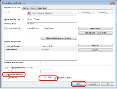 Selezionare [Imposta l'ora d'invio] → specificare l'ora di invio del fax → fare clic su [OK].
