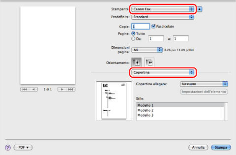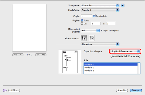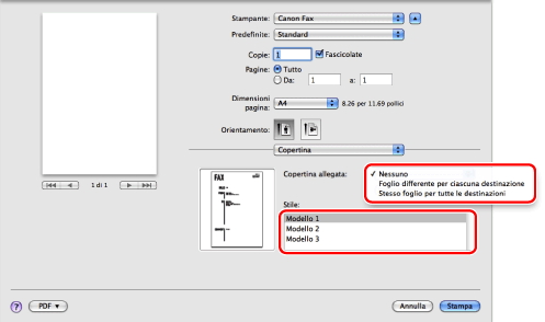 Per allegare una copertina, selezionare un'opzione da [Copertina allegata] → selezionare un modello di copertina da [Stile].