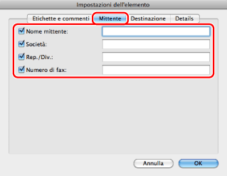 Fare clic su [Mittente] → selezionare le voci relative al mittente che si desidera stampare sulla copertina → immettere le informazioni.