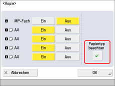 Wenn Sie [Kopie] wählen, können Sie einstellen, ob der Papiertyp beachtet wird.
