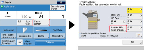 Berühren Sie nacheinander die Tasten [Papier wählen] → [Pap.für MP-Fach ändern].