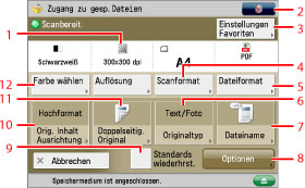 Berühren Sie diese Taste, um Scaneinstellungen abzurufen oder häufig verwendete Einstellungen in den <Einstellungen Favoriten> zu speichern. |