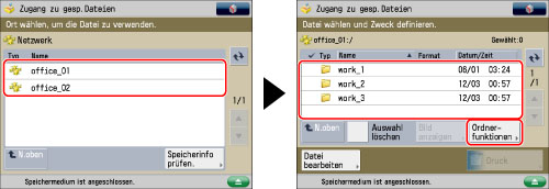 Wählen Sie den gewünschten Speicherort → Wählen Sie die gewünschte Ordnerebene → Berühren Sie die Taste [Ordnerfunktionen].