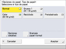 Si se muestra [Person.] como tamaño de papel cuando cargue papel estándar, pulse [Tamaño personaliz.] → [Cancelar opc.]. El tamaño del papel se detectará automáticamente y se mostrará en la pantalla.
