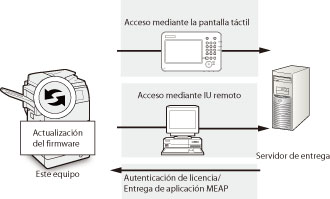 Puede actualizar el firmware del equipo a la versión más reciente con la función "Registrar/Actualizar software". Puede utilizar esta función tanto desde la pantalla táctil como desde el ordenador (IU remota).