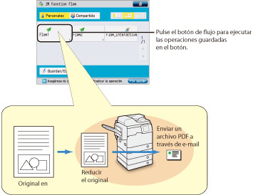 Estas aplicaciones le permiten guardar una combinación de funciones que utilice frecuentemente en el botón "flujo". Podrá utilizar repetidamente la misma combinación de funciones con total sencillez, simplemente pulsando este botón.
