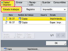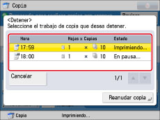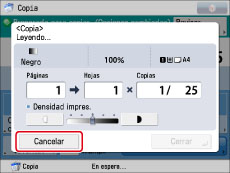 Si pulsa [Cancelar] en la pantalla emergente que aparece mientras el equipo está copiando o esperando para iniciar la copia, puede cancelar el trabajo que se esté copiando en ese momento o el último trabajo para el que leyó un original y que está en espera de ser copiado.