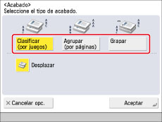 Si está activada la función [Autoclasificar], se establecerá automáticamente el modo Clasificar o el modo Clasificar y desplazar al poner los originales en el alimentador. (Consulte "Activar la clasificación automática".)