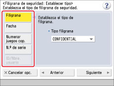 El texto que introduzca en [Person.] no se guarda automáticamente. Si usa [Filigrana de seguridad] y desea guardar la filigrana de seguridad recién creada para seleccionarla cuando lo necesite, pulse [Guardar] → introduzca el texto que va a guardar.