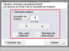 La opción [Ajustar contraste caracteres/fondo] se cancela cuando finaliza el trabajo. Si desea utilizar las mismas opciones para el siguiente trabajo de copia, vuelva a especificar la configuración.
