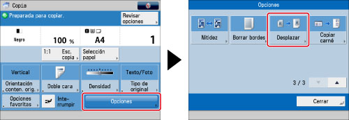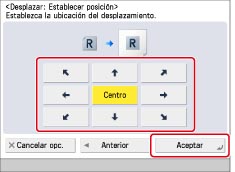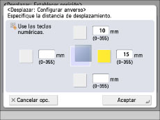 Si selecciona [Con teclas numéricas], es posible que la imagen del original se corte parcialmente en la copia. La cantidad que se corta depende del tamaño del original, el tamaño del papel de copia y el grado de desplazamiento especificado.