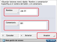 Si selecciona [Inf. aut. inic. sesión disp.] para [Inf. usada para aut. TX/exploración de arch.] en [Opciones de funciones] (Configuración), una contraseña para un destino de archivo no está guardada en un botón personal o en un botón compartido del Menú rápido. Para más información sobre las opciones para [Inf. usada para aut. TX/exploración de arch.], consulte "Especificar el método de autenticación para servidor de archivos".