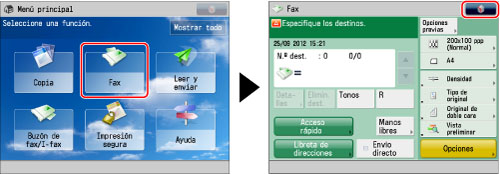 En la pantalla de funciones básicas de fax aparecen cuatro accesos directos a las opciones. [Densidad], [Tipo de original], [Original de doble cara], y [Vista preliminar] aparecen de forma prefijada. Estos accesos directos pueden cambiarse por las funciones que utiliza con frecuencia.