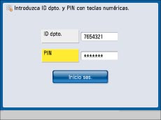 Es necesario activar [Gestión de ID de departamentos] para activar todas las funciones de [Limitar funciones] a fin de llevar a cabo la autenticación de usuarios. Introduzca un ID de departamento o PIN o bien el ID del administrador del sistema o PIN admdor. del sistema para iniciar sesión en el equipo.