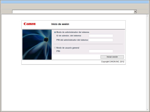 Seleccione [Modo de administrador del sistema] e introduzca un ID del administrador del sistema o un PIN admdor. del sistema y, a continuación, haga clic en [Iniciar sesión] para iniciar sesión en la IU remota o en una aplicación MEAP (incluidas las aplicaciones de inicio de sesión).