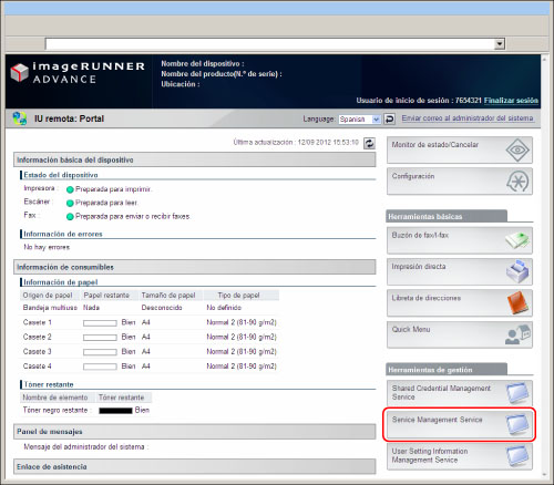 Haga clic en [Service Management Service] en la página del portal de IU remota.