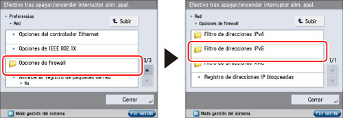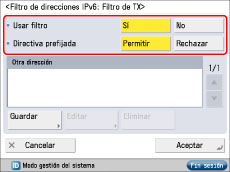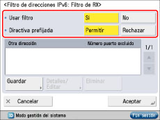 Si se intenta la transmisión/recepción de datos entre un dispositivo, cuya dirección IPv6/número de puerto se haya establecido para rechazarse, se generará un registro de bloqueo. Para mostrar el registro de bloqueo, "Comprobar el registro de bloqueo".
