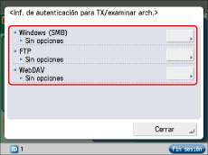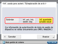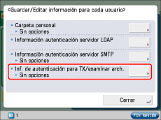 Utiliza la información para autenticación de servidor de archivos establecida en el equipo. (Consulte "Guardar una dirección de servidor de archivos".) No se requieren más ajustes para cada usuario.