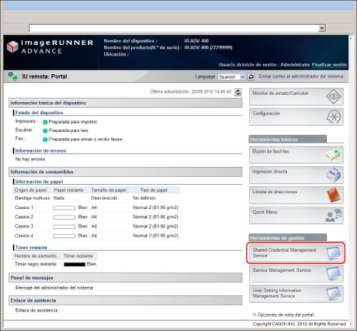 Haga clic en [Shared Credential Management Service] en la página de portal de la IU remota.