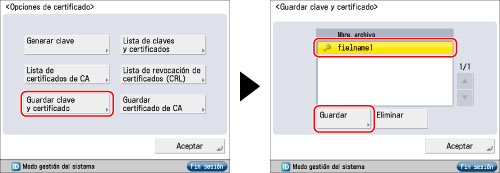Es posible instalar en el equipo un par de claves y un archivo de certificado de servidor creados en un ordenador si utiliza un navegador web (IU remota). El procedimiento para guardar archivos instalados en el equipo mediante el panel de control es el siguiente: