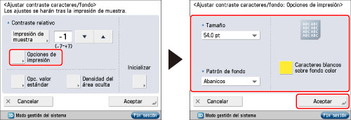 Como opción prefijada, [Caracteres blancos sobre fondo color] no está seleccionada en la pantalla Opciones de impresión para realizar una impresión de muestra. Si selecciona [Caracteres blancos sobre fondo color], establezca [Opc. valor estándar] para la densidad del texto y [Densidad del área oculta] para la densidad del fondo.