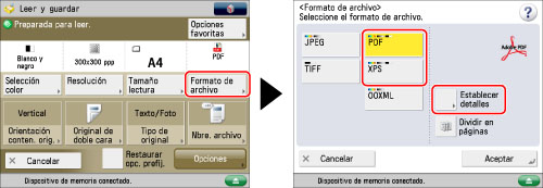 Si selecciona [Compacto] para el formato de archixsmodo de color cambia de [Auto (Color/Negro)] y [Blanco y negro] a [Auto (Color/Gris)] y [Escala de gris]. Si desea leer el documento con el modo de color que especifique, cambie el formato de archivo PDF o XPS a otro distinto de [Compacto] o [Trazar y suavizar].