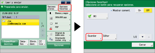 Si selecciona [Inf. aut. inic. sesión disp.] para [Inf. usada para aut. TX/exploración de arch.] en [Opciones de funciones] (Configuración), la contraseña para un destino de archivo no se guarda en un botón de opciones favoritas. Para más información acerca de las opciones para [Inf. usada para aut. TX/exploración de arch.], consulte "Especificar el método de autenticación para servidor de archivos".