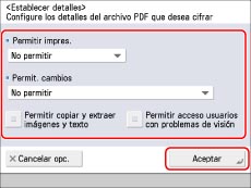 Puede guardar las opciones para archivos PDF cifrados en sus Opciones favoritas. Si no desea establecer contraseñas para [Contraseña abrir docum.] y [Contraseña de permisos] en [Opciones favoritas], deje la contraseña en blanco.