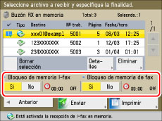 Si se desactiva <Bloqueo de memoria de fax> y/o <Bloqueo de memoria I-fax>, los archivos recibidos mediante la función de fax/I-fax se imprimen automáticamente y se eliminan del buzón de recepción en memoria.