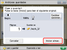 Si aparece la siguiente pantalla después de leer el último lote de originales, pulse [Iniciar almac.].