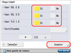 Pulse [Seguridad] → seleccione [Sí] o [No] para el mensaje de advertencia cuya opción desee cambiar → pulse [Aceptar].